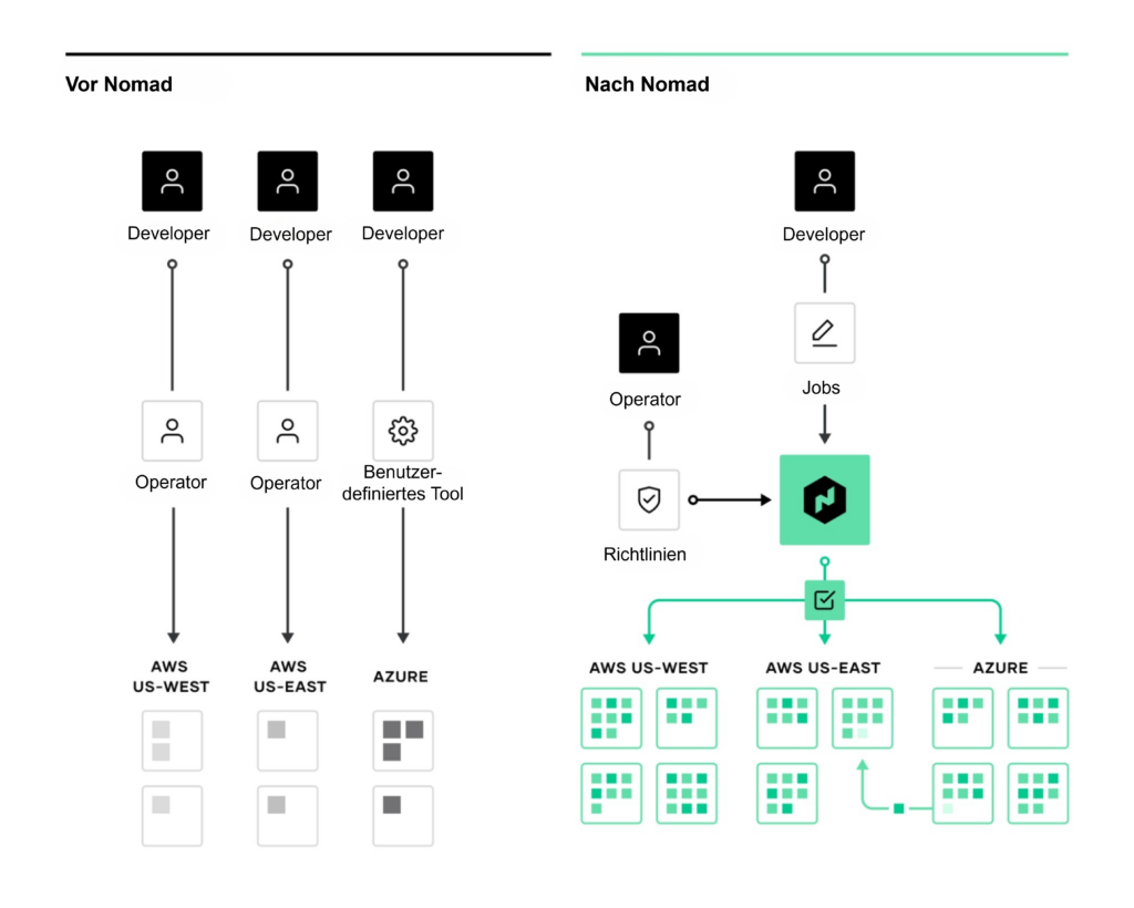 Entwicklerteams erstellen oft ihre eigenen Toolchain- und Deploymentprozesse, was ineffizient sein kann. Nomad ermöglicht es Unternehmen, sich auf eine einzige Spezifikation und einen einzigen Workflow für die Ausführung verschiedener Arten von Anwendungen in Clouds zu standardisieren.