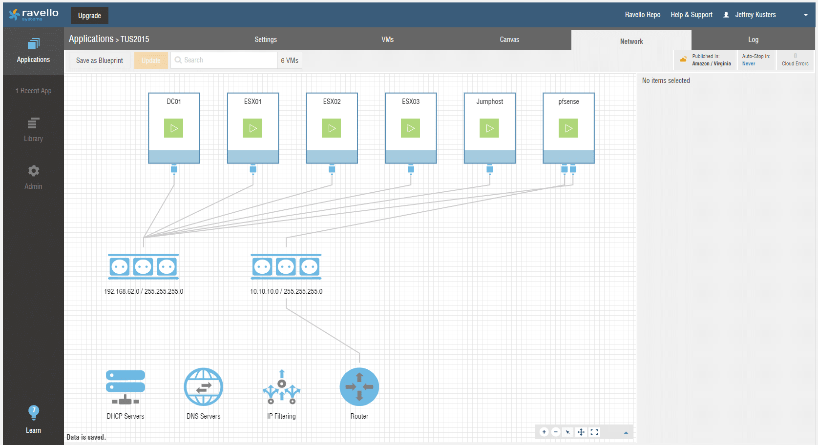 To summarize, I now have a 3 node ESXi6.0 VSAN cluster, a Windows based jumphost which was running vCenter 6.0, a domain controller and a firewall appliance with an IPSec VPN tunnel to my cloud instance. In the Ravello interface the network setup looks like this: