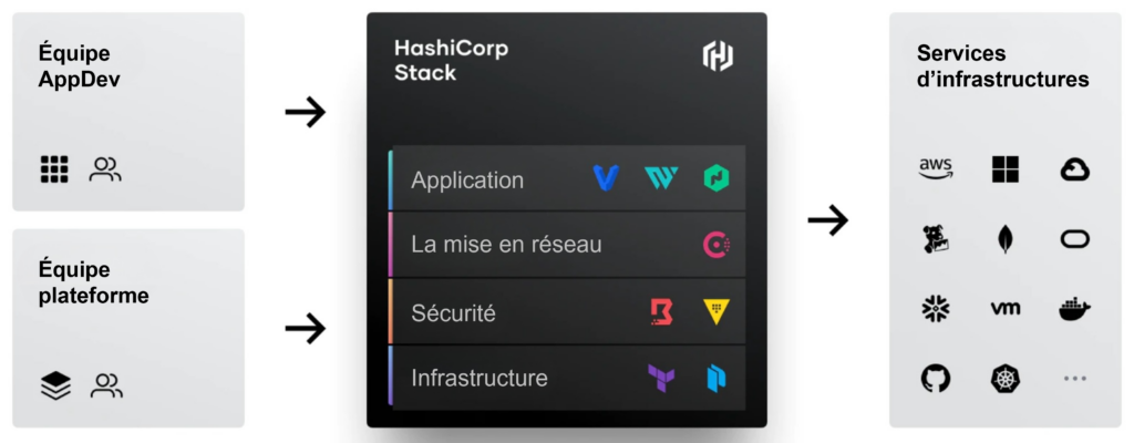 Pour leurs applications les plus importantes, des milliers d'entreprises utilisent un modèle d'exploitation cloud basé sur les produits HashiCorp afin d'approvisionner, de sécuriser, de connecter et d'exploiter une infrastructure en nuage. La plateforme de logiciels d'automatisation HashiCorp est utilisée par des équipes en charge de plateformes dans le monde entier afin d'améliorer la vélocité des développeurs, de réduire les risques et d'optimiser l'efficacité.