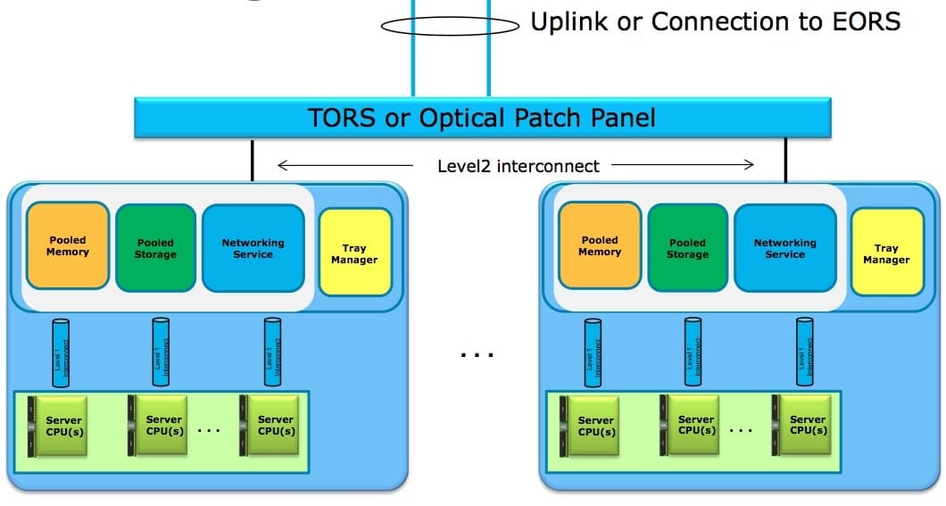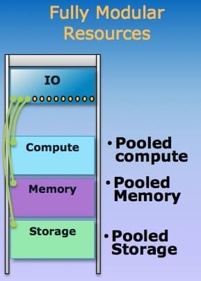 In the future Intel envisions fully modular resources in a rack. The compute, memory, storage and IO resources are segregated and pooled at the physical layer.