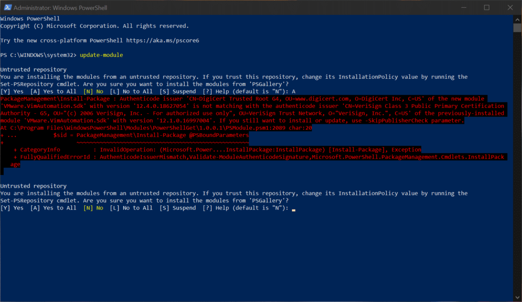 Today I was updating my PowerShell modules on my local system but I ran into an issue related to certificates. After some investigation, it appeared that the PowerCLI Update was failing. Every PowerCLI module that it tried to update returned an error and did not update to a newer version. In this blog post, I …