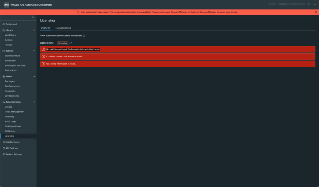 After upgrading to VMware Aria Automation Orchestrator 8.18.1 update 2, I was greeted with a warning banner that read: “Your subscription has expired. The core product operations are unavailable.“. Here’s a screenshot of the message as it appears on the License page in Aria Automation Orchestrator — just in case you’re wondering how it looks …