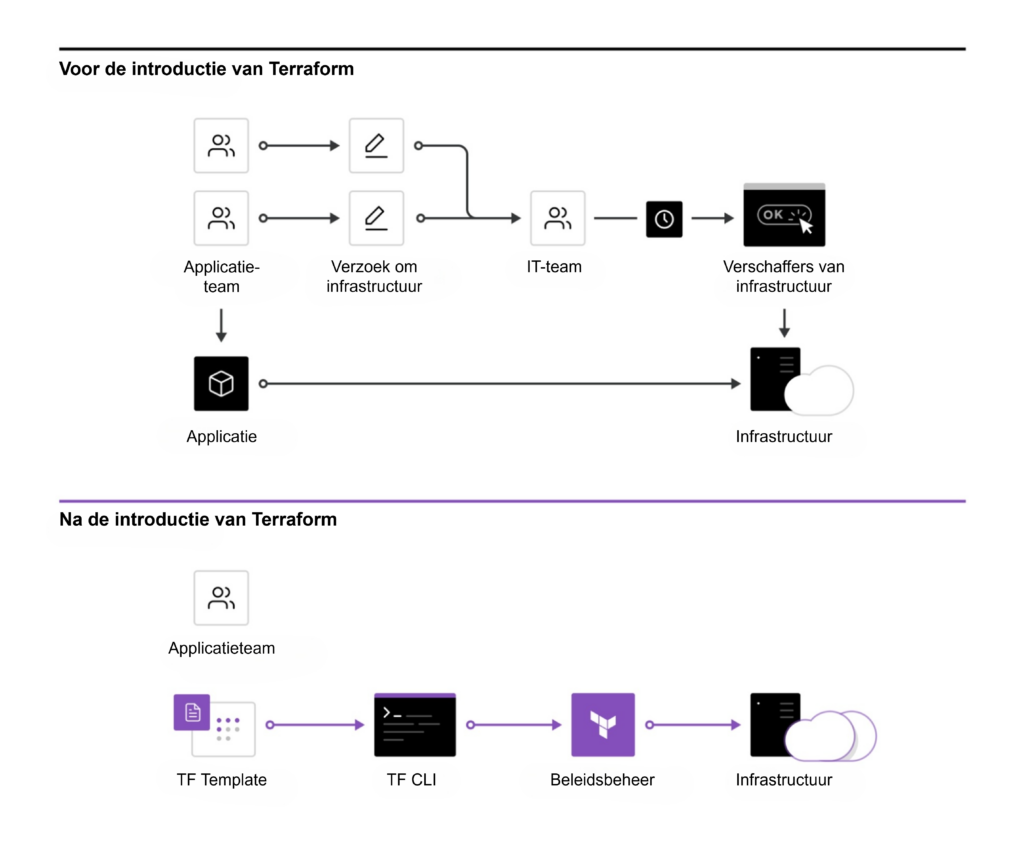 Het automatiseren van de verschaffende werkprocedure met behulp van HashiCorp Terraform maakt toegang tot infrastructuur voor applicatieteams op verzoek mogelijk en wel via op voorhand goedgekeurde sjablonen. Deze werkprocedure maakt het handmatig controleren en goedkeuren van aanvragen voor bedrijfsmiddelen overbodig.