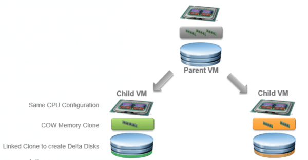 The newly created and customized linked clone will use the memory and disk of the parent VM until something changes within the linked clone. The changes (depending of memory or disk) will be placed in a delta memory page or disk. When the users logs off, the profile is synchronized and the VM is cleaned up. The in-memory-fork-linked-clone is also called a Just-in-Time (JIT) desktop.