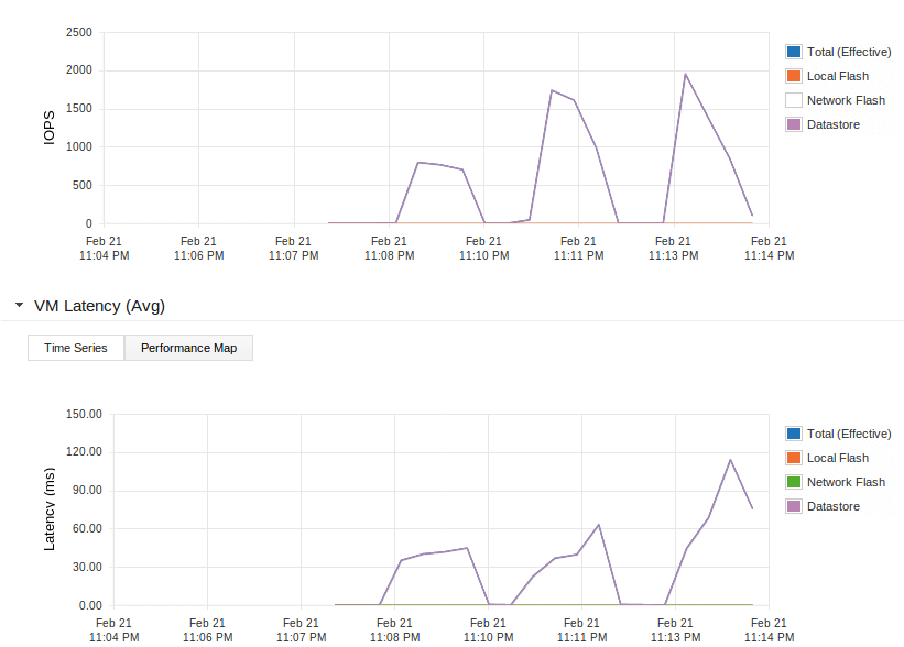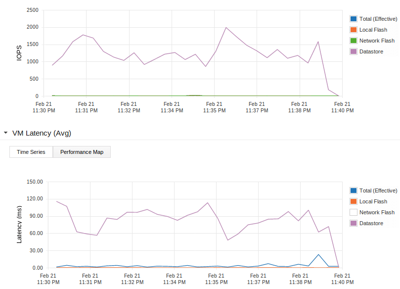 The purple line in both graphs shows the activity on the NAS. You’ll see that the number of IOPS to the NAS is low and the latency on the NAS is very high. But the VMs experience the latency indicated by the blue line which is nice and low.