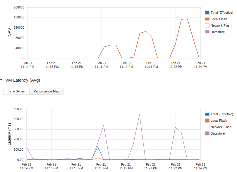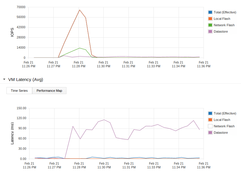 Again the upper graph is the number of IOPS, the lower is the Latency. You may notice the different colors in the graph now. In the previous test we just used the datastore, no flash. In this test the red line represents the local flash and the purple line the datastore.