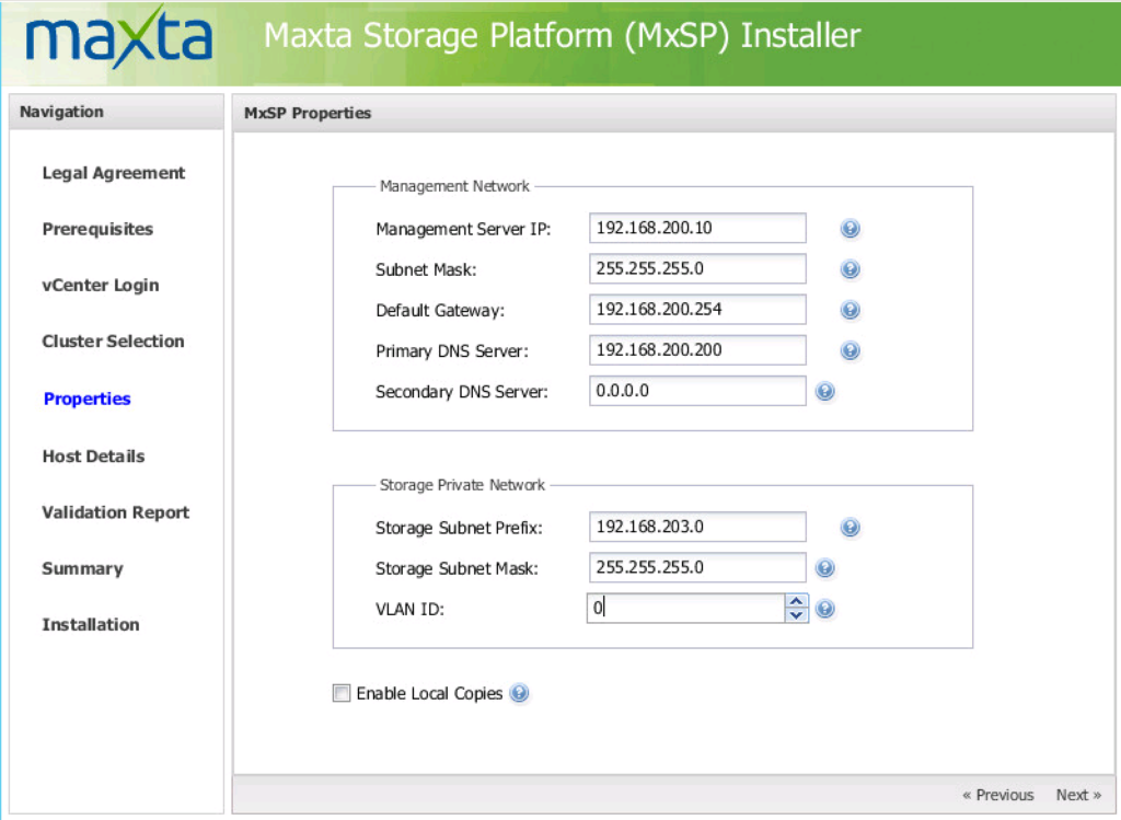 One thing that is a bit tricky, is the “Enable Local Copies” option. As MxSP doesn’t support hardware raid controllers, they want you to add all available disks as a separate entity. The “Enable Local Copies” option, lets you replicate data on disks to other disks in the node. An even number of disks is needed to let this work. The version of MxSP we used, lets you set the checkbox without an even number of disks.