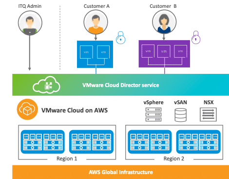 For customers looking for an even smaller footprint, VMware Cloud Director Service offers a flexible and agile entry point into VMware Cloud on AWS. As a VMware Cloud on AWS Managed Service Provider, ITQ will be able to leverage VMware Cloud Director Service to deliver a multi-tenant platform to customers: