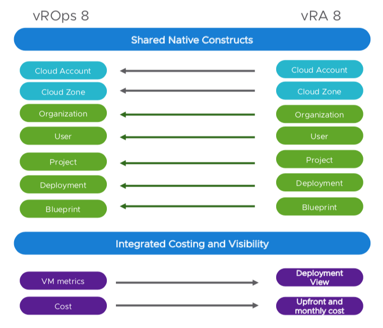 Another great integration is the “Shared Constructs” idea between vRA & vROps (not to confuse with vRO). The shared constructs creates a better synergy between operations and automation by using the same: Cloud Zones, Cloud Accounts, Projects, Users, Blueprints etc. This brings consistency within the different products and it can help with aligning new vRA dashboards to operational workflows. This all makes the CMP easier and more consistent, which can also help both IT and business to better understand deployment costs or even in estimating certain costs.